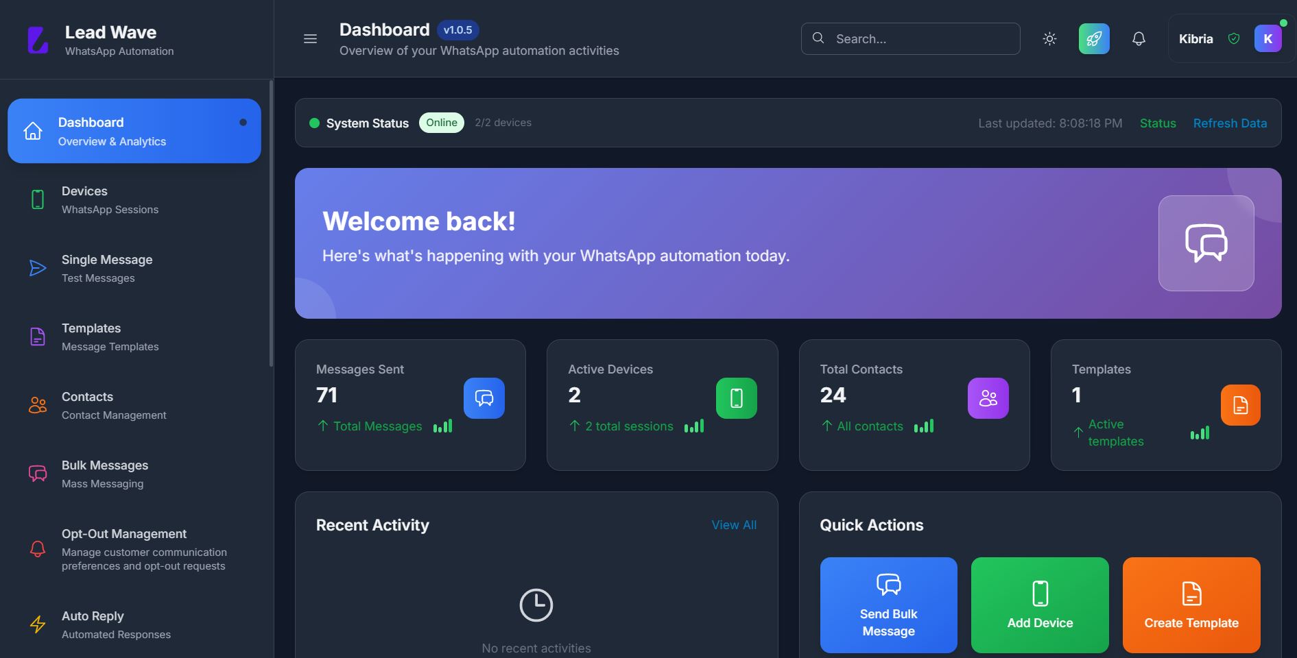 Lead Wave is an advanced WhatsApp marketing automation tool designed to help you connect with your audience faster and more effectively. Whether you’re running promotions, sending updates, or nurturing leads, Lead Wave simplifies everything with smart automation and user-friendly tools.